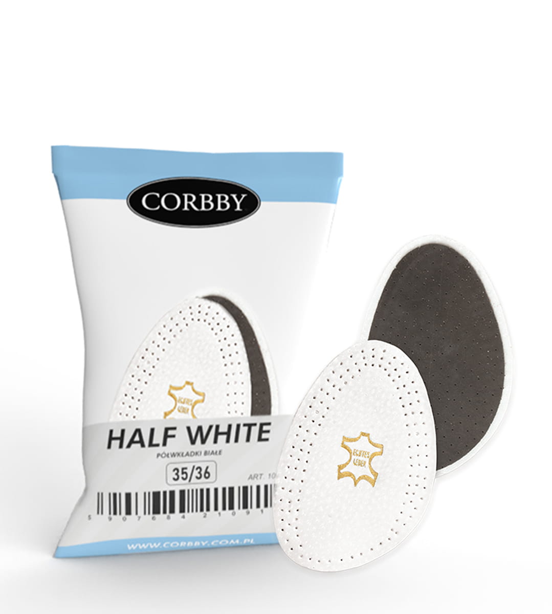 - Dwuwarstwowe półwkładki wykonane ze skóry naturalnej i miękkiej lateksowej pianki w kolorze białym,