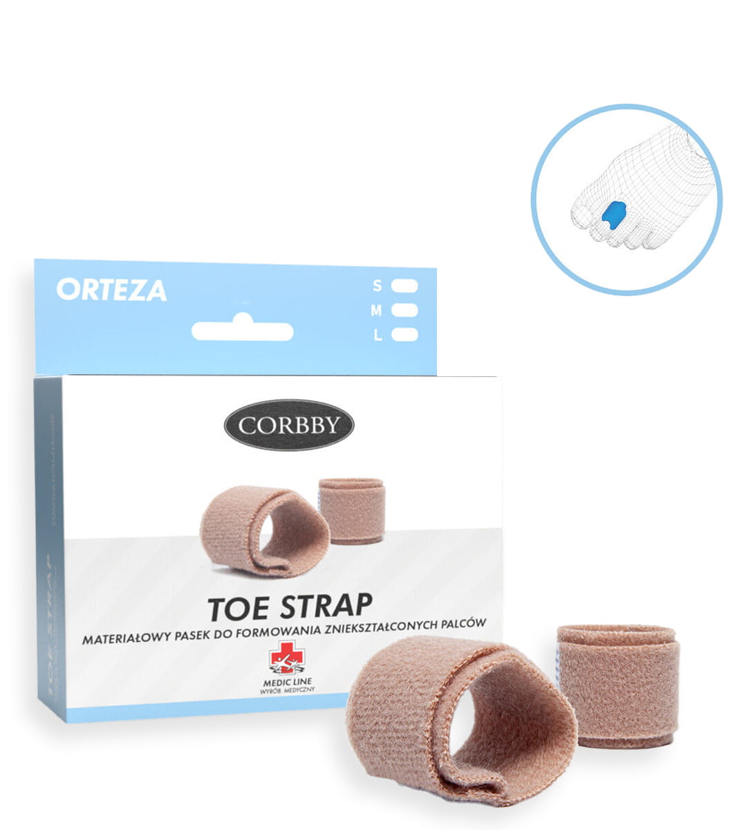Materiałowy pasek do formowania zniekształconych palców. Przeznaczony dla osób z deformacjami palców, zniekształconymi, palcami młotkowatymi oraz młoteczkowatymi. Pasek ściąga i ustawia w prawidłowym położeniu zdeformowane palce, a zapięcie rzepowe pozwala utrzymać ortezę w jej pierwotnym położeniu. Materiał jest miękki oraz nie zabiera powierzchni między palcami oraz w obuwiu.